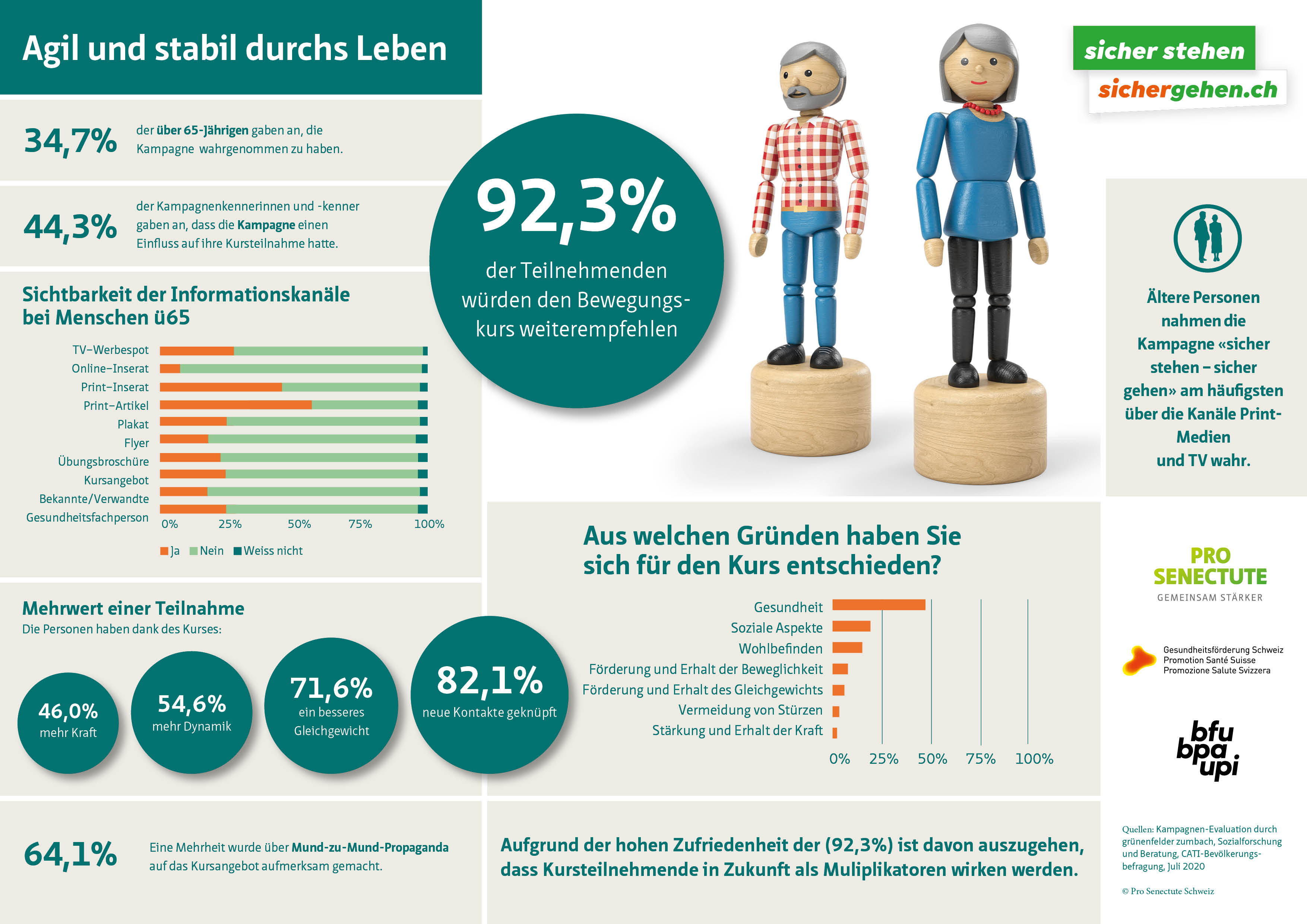 Die Evaluation der Kampagne zeigt erfreuliche Resultate: 35% der über 65-Jährigen gaben an, die Kampagne wahrgenommen zu haben. Davon fanden 44%, dass die Kampagne einen Einfluss auf ihre Kursteilnahme hatte. Zudem wirken sich unsere Bewegungsangebote sehr positiv auf die mentale und psychische Gesundheit der Senioren aus.